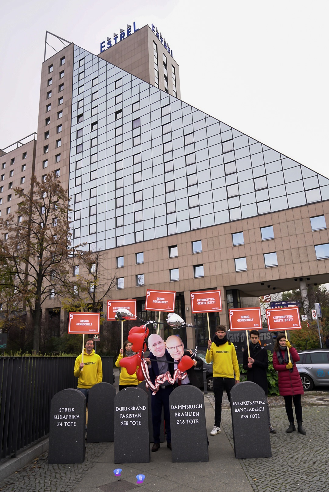 Dieser Kuschel-Kurs muss ein Ende haben! Daher haben wir mit der Initiative Lieferkettengesetz am 12.11.19 mit einer Protestaktion vor dem Tagungszentrum des Deutschen Arbeitgebertags gegen den „Kuschelkurs“ von Bundeswirtschaftsminister Peter Altmaier mit der Bundesvereinigung der Deutschen Arbeitgeberverbände (BDA) protestiert. Denn diese Verflechtungen zwischen Altmaier und BDA-Chef Steffen Kampeter geht zulasten der Menschenrechte.
