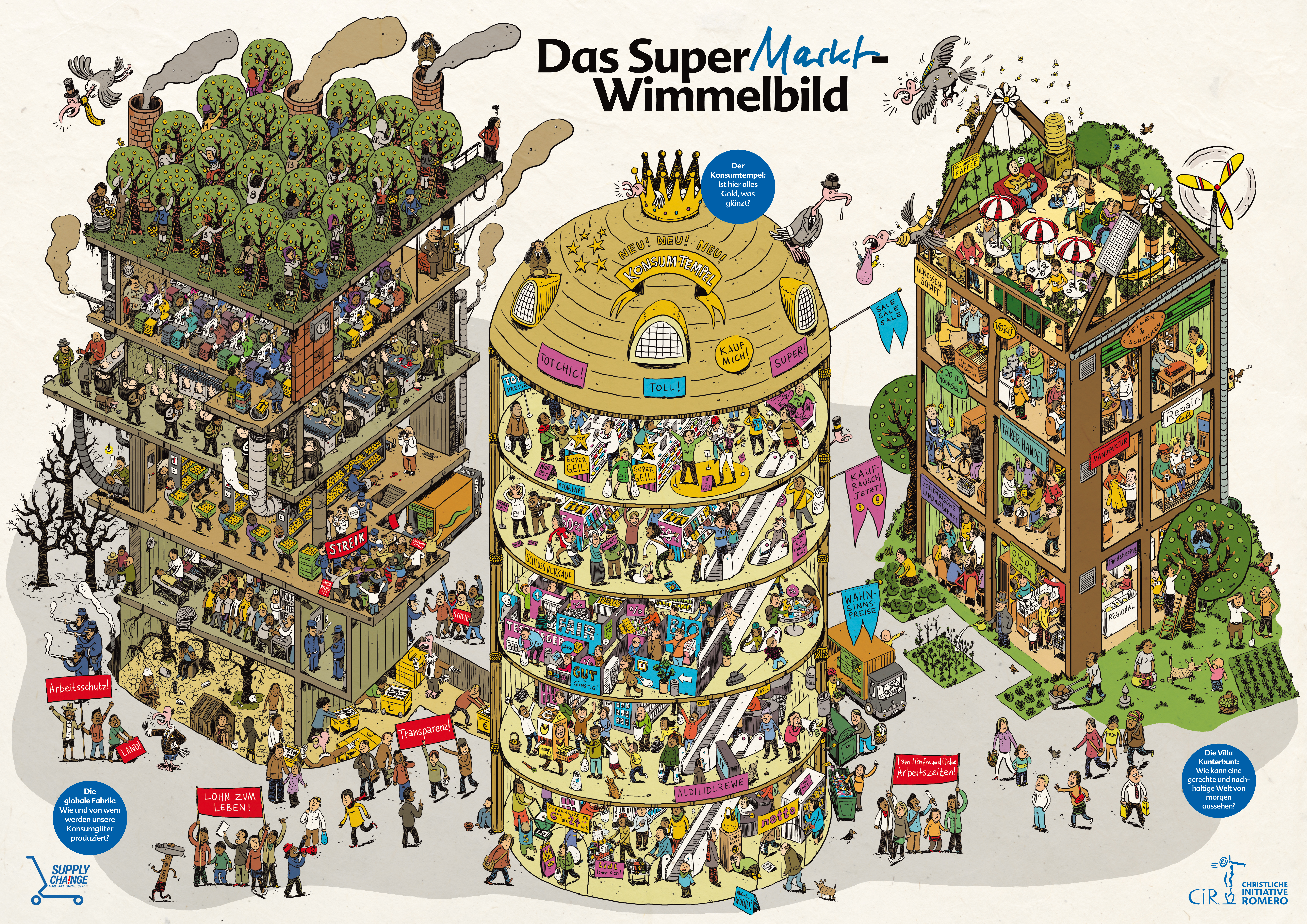 Das Wimmelbild kann gut als Aufhänger zum Thema kritischer Konsum genutzt werden, ist aber auch eine spielerische Ergänzung zu beispielsweise der Ausstellung „Lebenswelten. Arbeiter*innen entlang der Lieferkette von Orangensaft berichten“